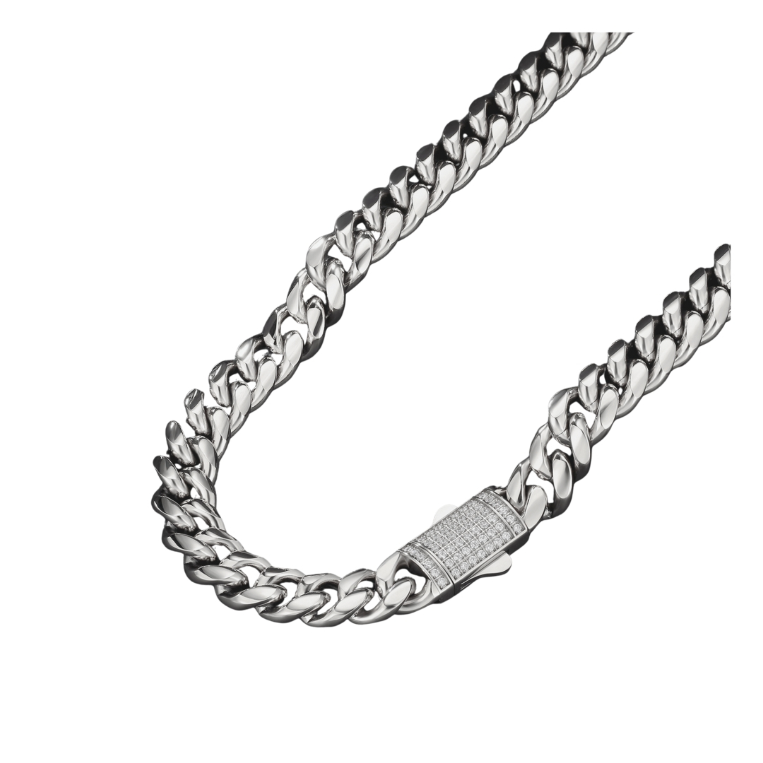 Lanțul Cuban Elements din oțel inoxidabil este o piesă statement, creată pentru bărbatul care își asumă un stil puternic și impunător. Cu o lățime de 12 mm, acest lanț oferă un impact vizual maxim, completat de detalii elegante cu pietre de zirconiu montate discret pe închizătoare.